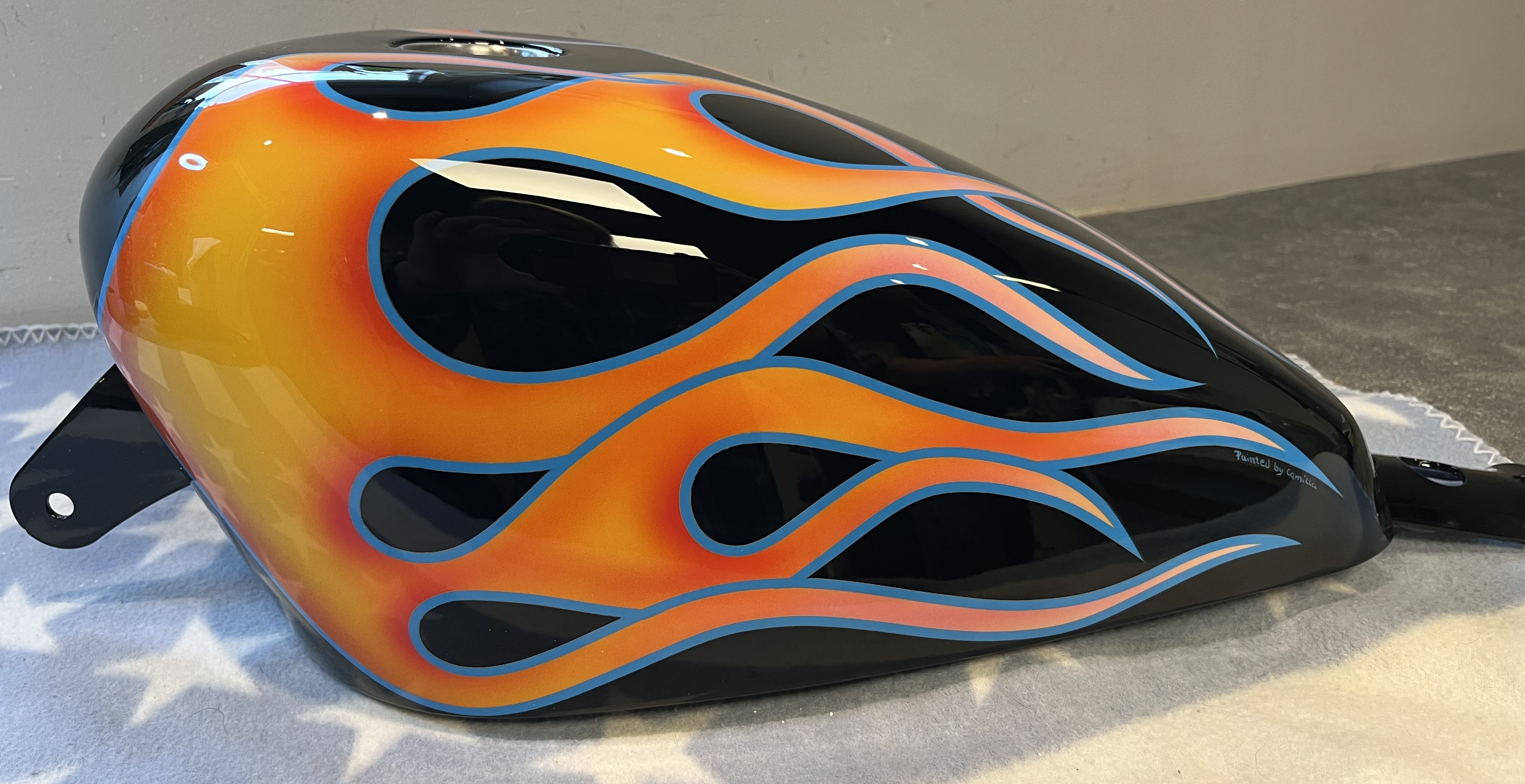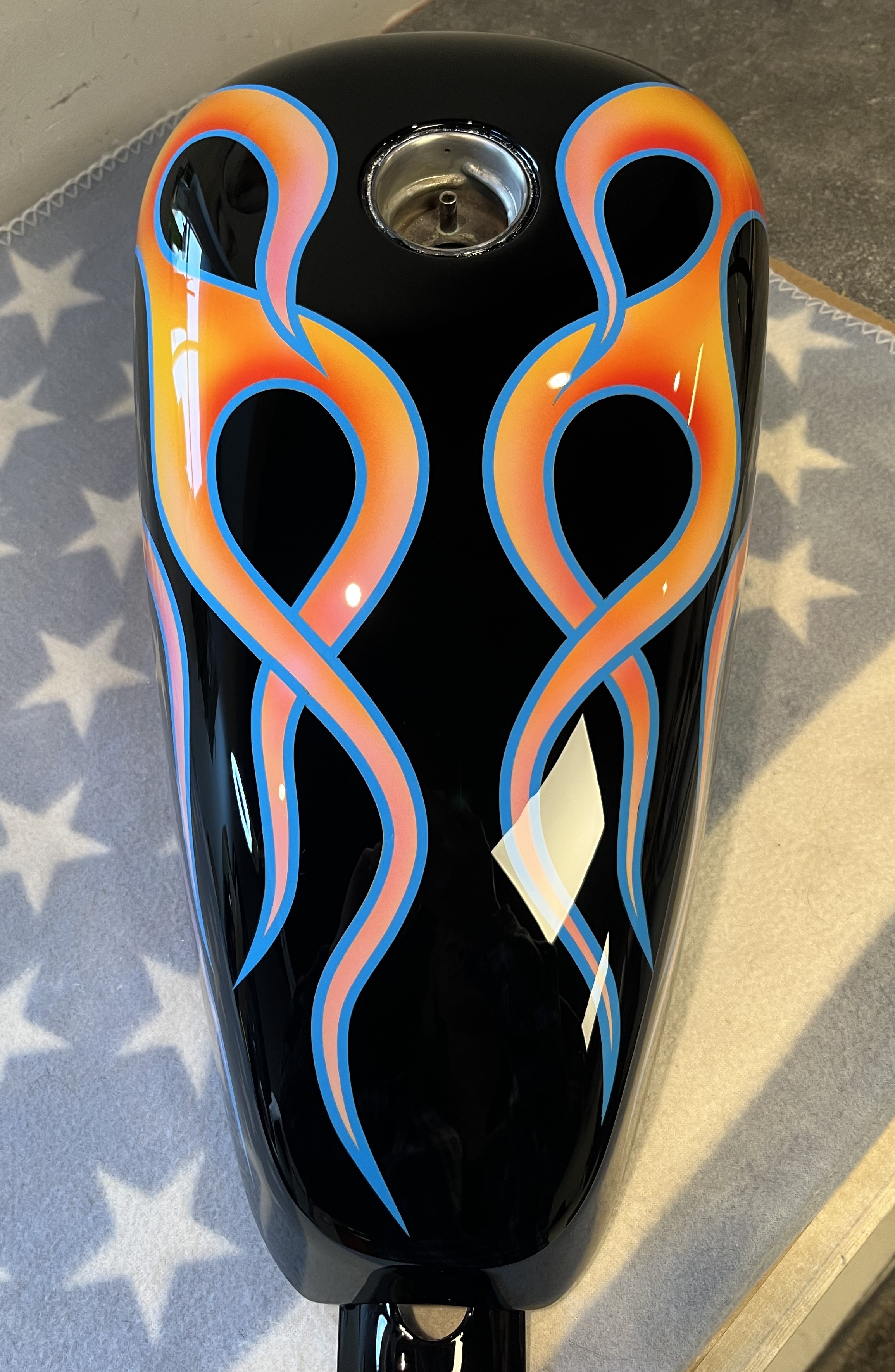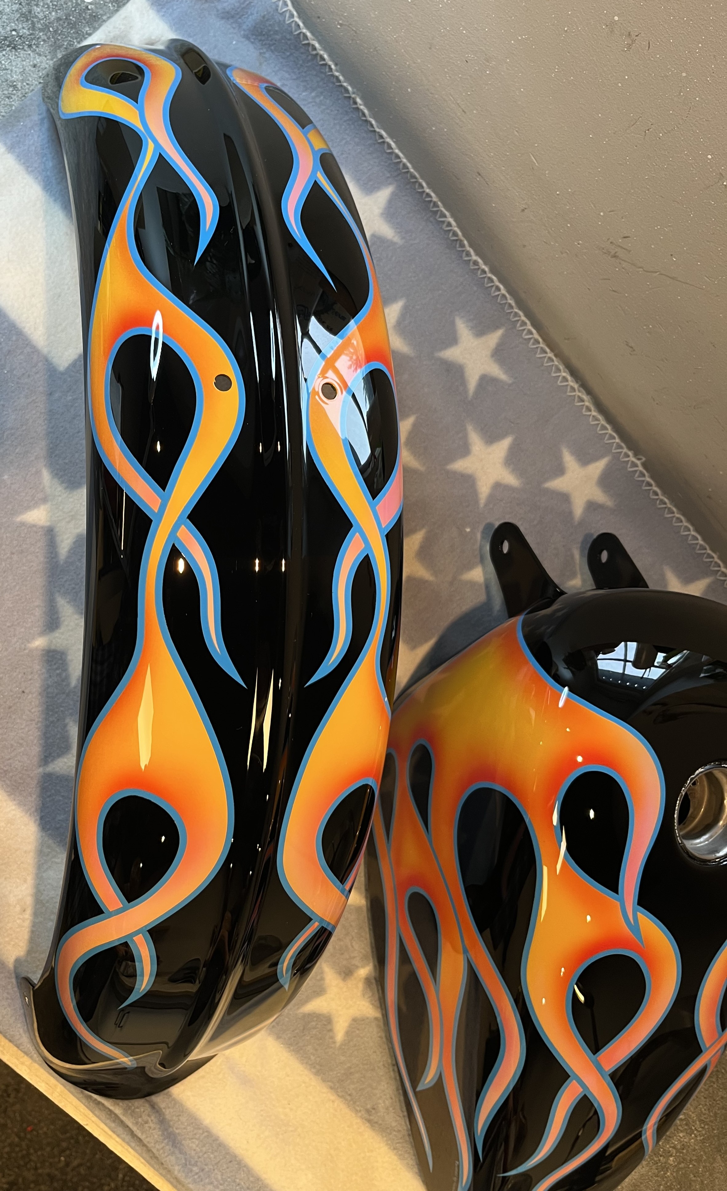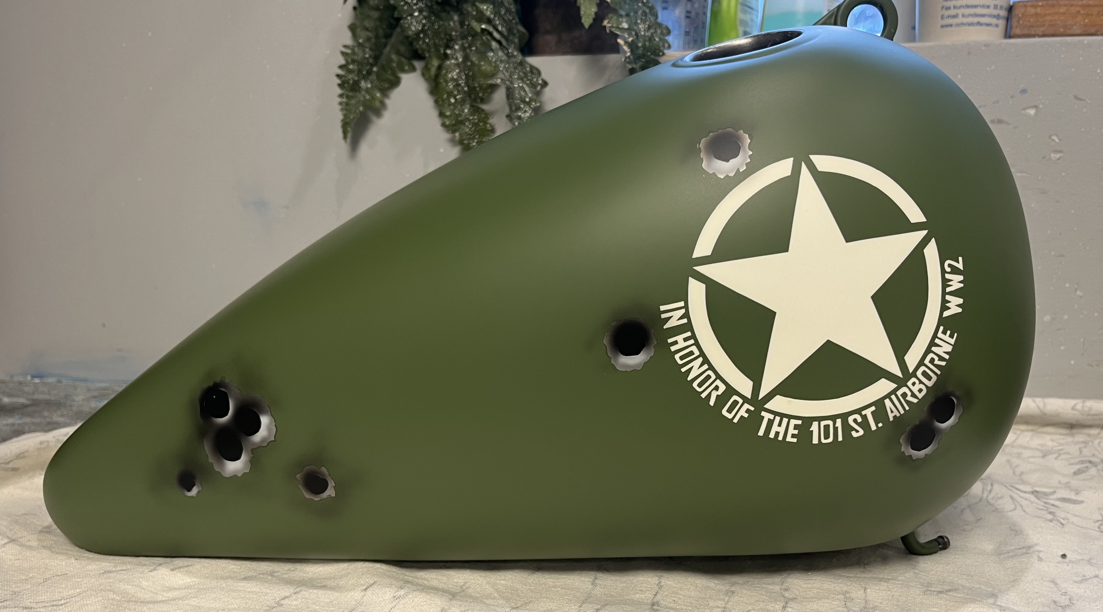 Her er enkeltmotiver samt forskjellige flammer, tekster osv jeg har laget. Alt etter kundens ønsker og blir laget for hånd. Det er utfordrende å ta bilde for å prøve å unngå gjenskinn så enkelte bilder ser kanskje litt feil ut.