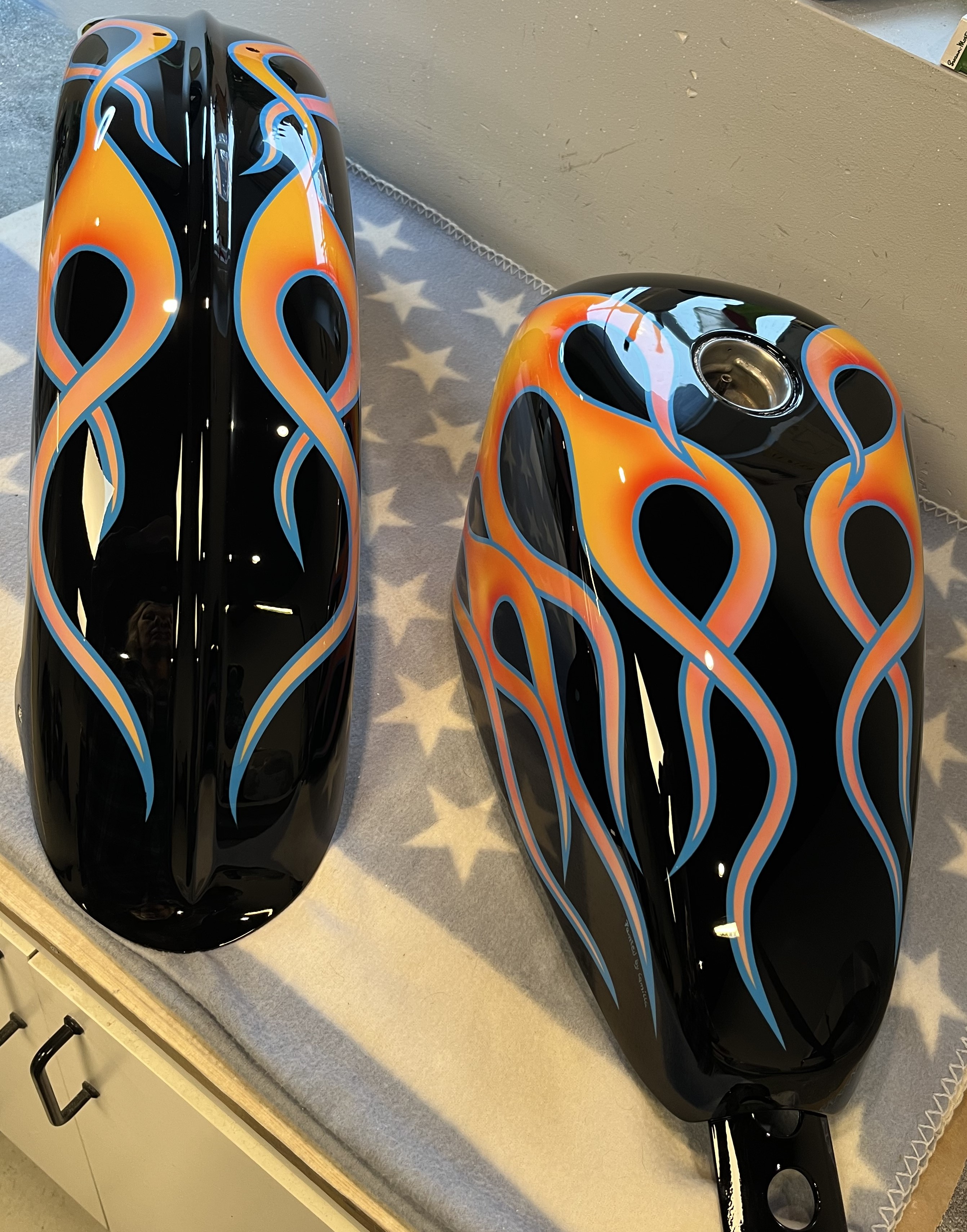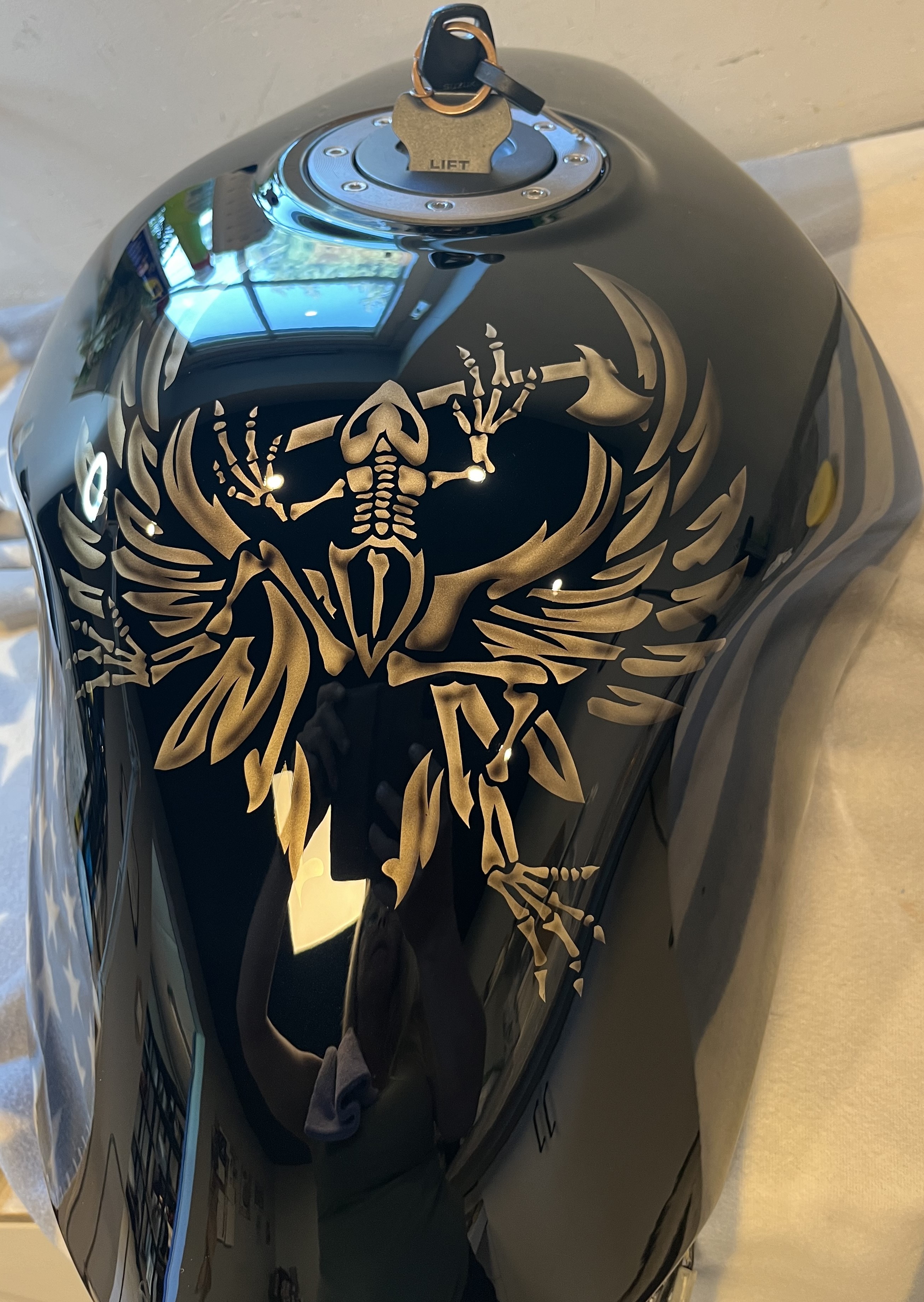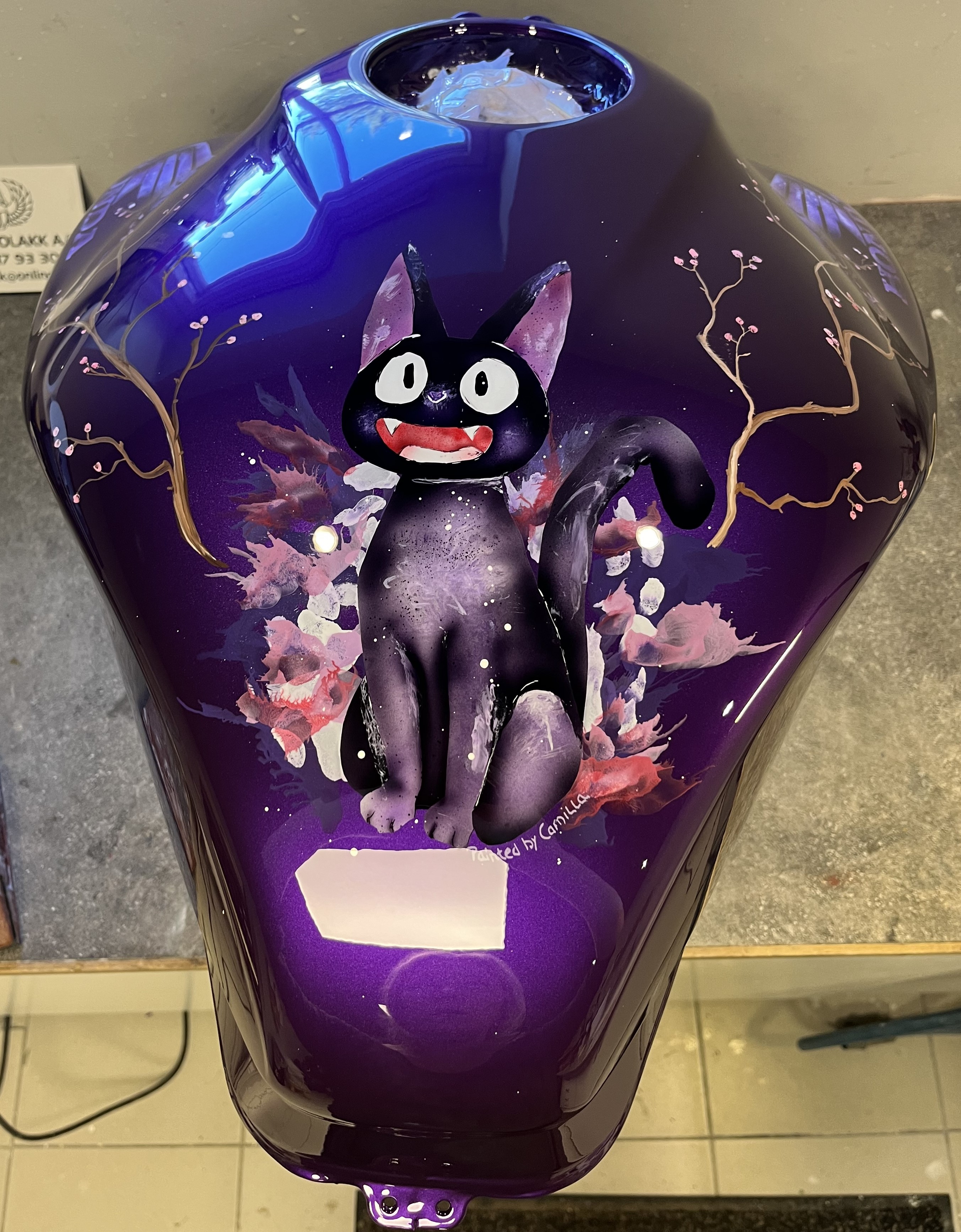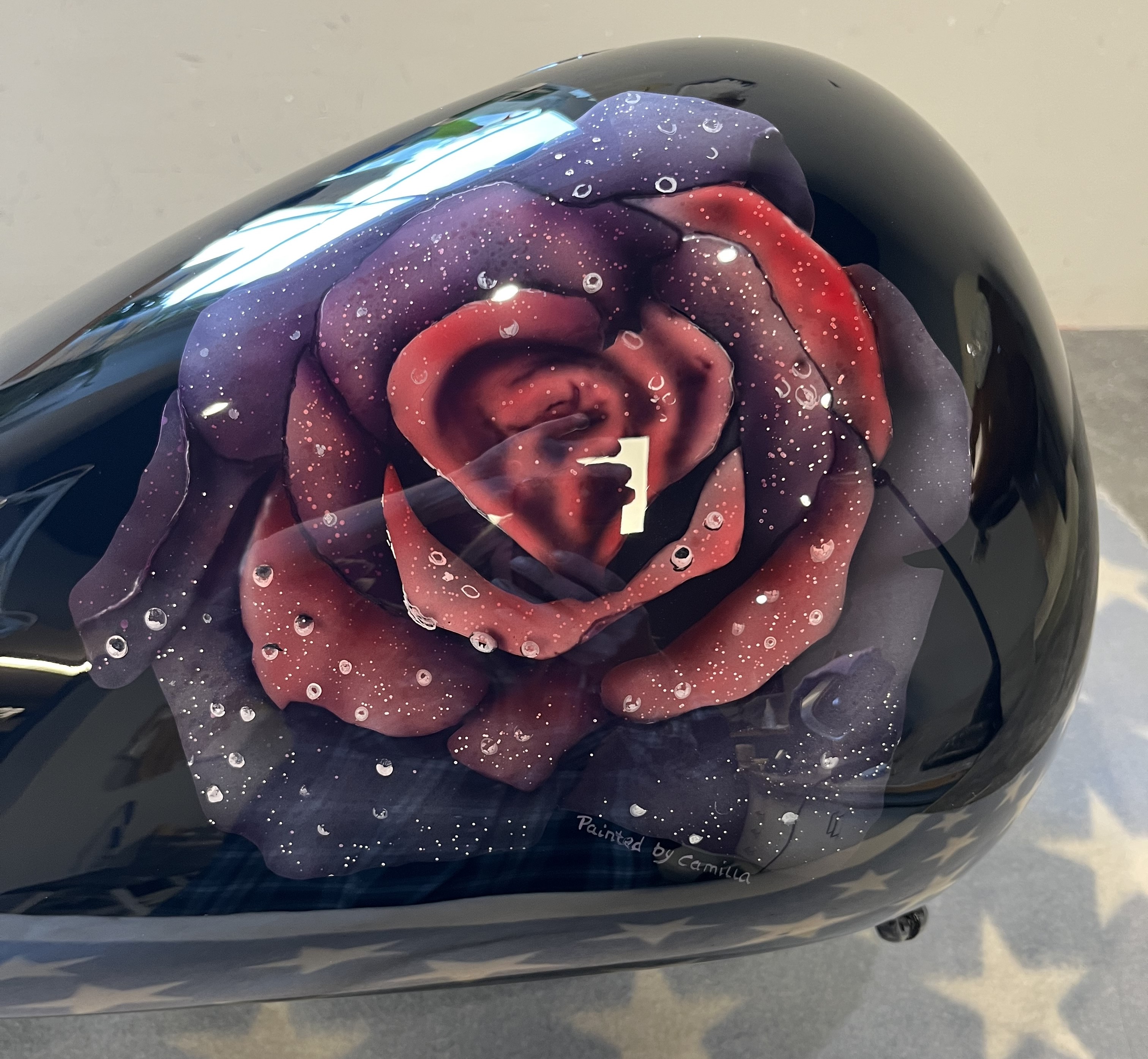 Her er enkeltmotiver samt forskjellige flammer, tekster osv jeg har laget. Alt etter kundens ønsker og blir laget for hånd. Det er utfordrende å ta bilde for å prøve å unngå gjenskinn så enkelte bilder ser kanskje litt feil ut.